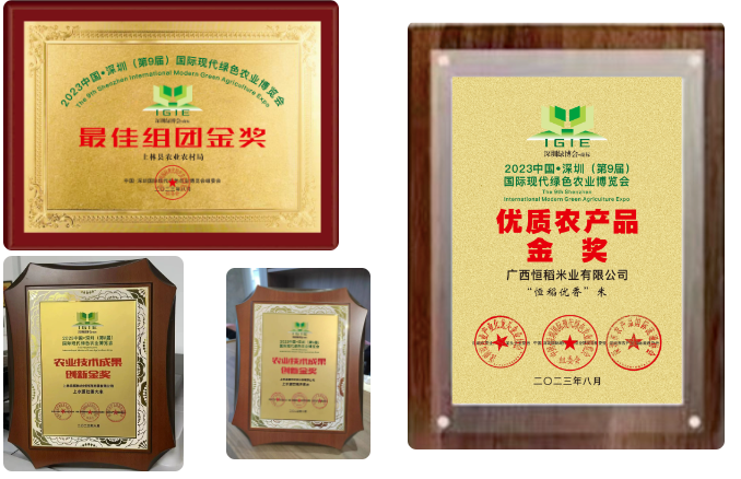第九届深圳绿博会颁奖仪式上,上林县农业农村局荣获最佳组团金奖、广西恒稻米业有限公司、上林县振林农村投资发展有限公司获得优质农产品金奖与农业高新技术成果创新金奖