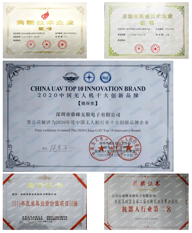 一路走来,鼎峰无限凭借不断的努力与坚持,荣获了“国家高新技术企业”、“特精特新企业”“深圳市高新技术企业”“2016年深圳市最具投资价值企业50强”、“2016年深圳10大最具成长力企业”、“2018深圳高科技高成长20强”、“2018年广东省无人机名牌产品”、“2020中国无人机十大创新品牌”、 “第二十二届中国国际高新技术成果交易会优秀产品”、“中国创新大赛第二届机器人行业赛第二名“等诸多荣誉。
