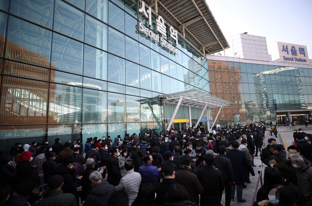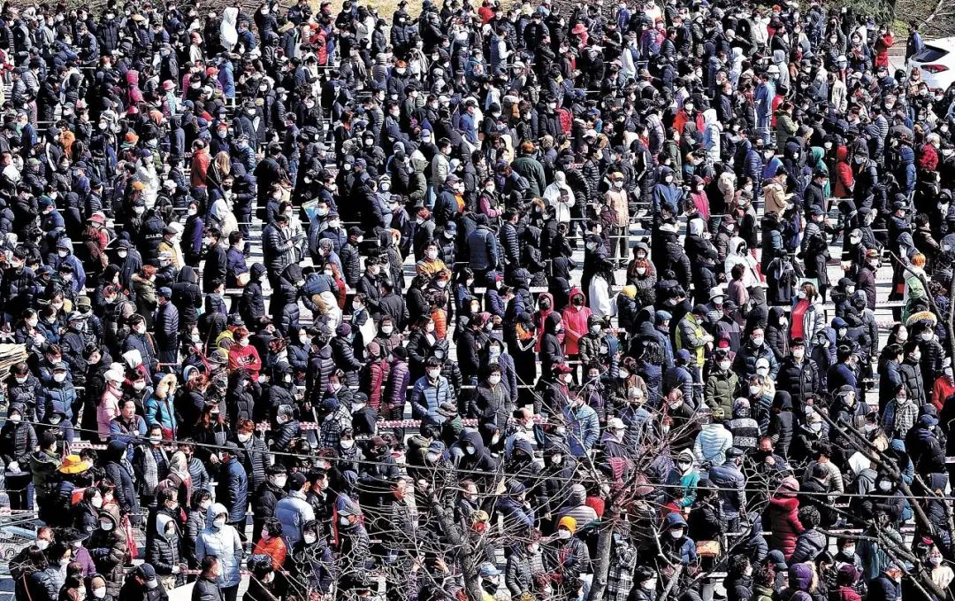 3月2日下午,首尔一处口罩销售点排起了千米长队。