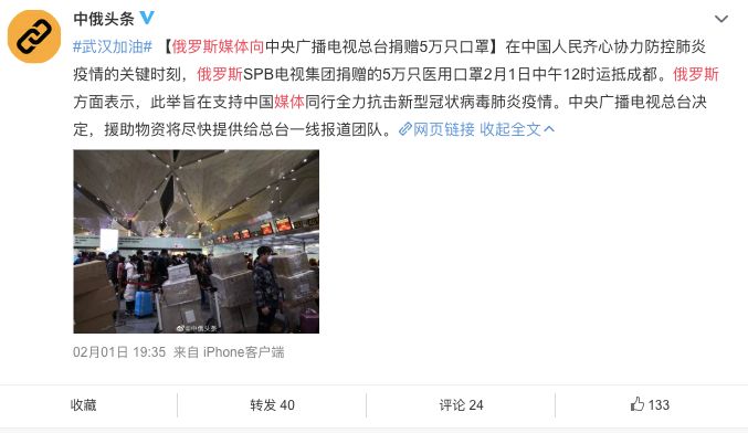 俄罗斯从2月1日至今,已经分三次给中国送来援助物资。