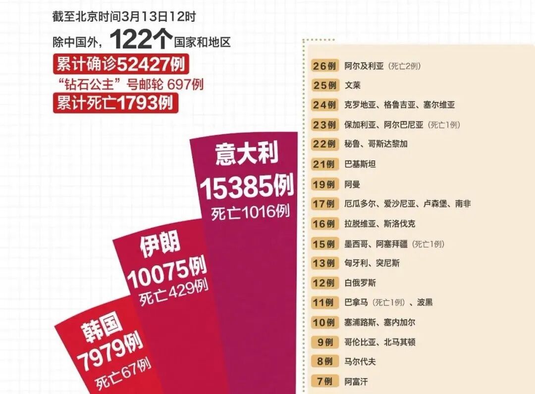 截止到3月13日12时,中国境外确诊已超5.3万例,122个国家和地区卷入。