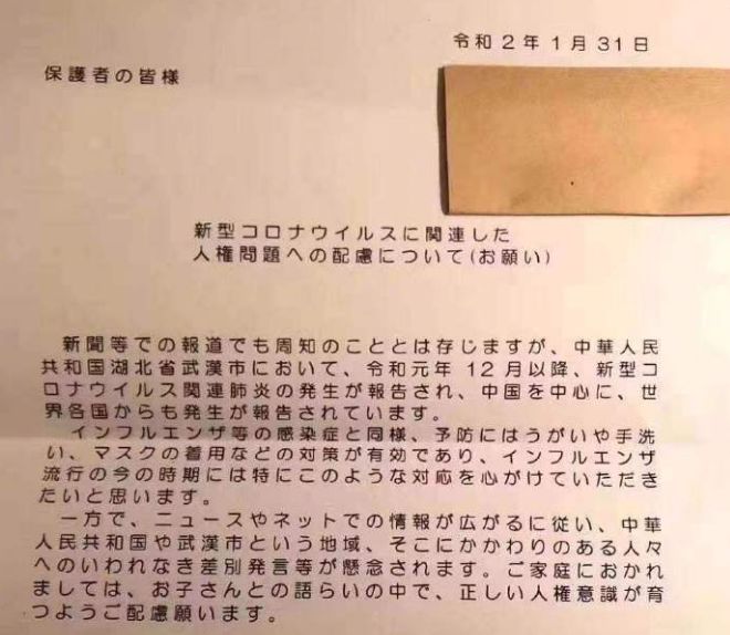 有日本学校给学生家长写信,教育孩子们不要带着恶意去谈论中国武汉。