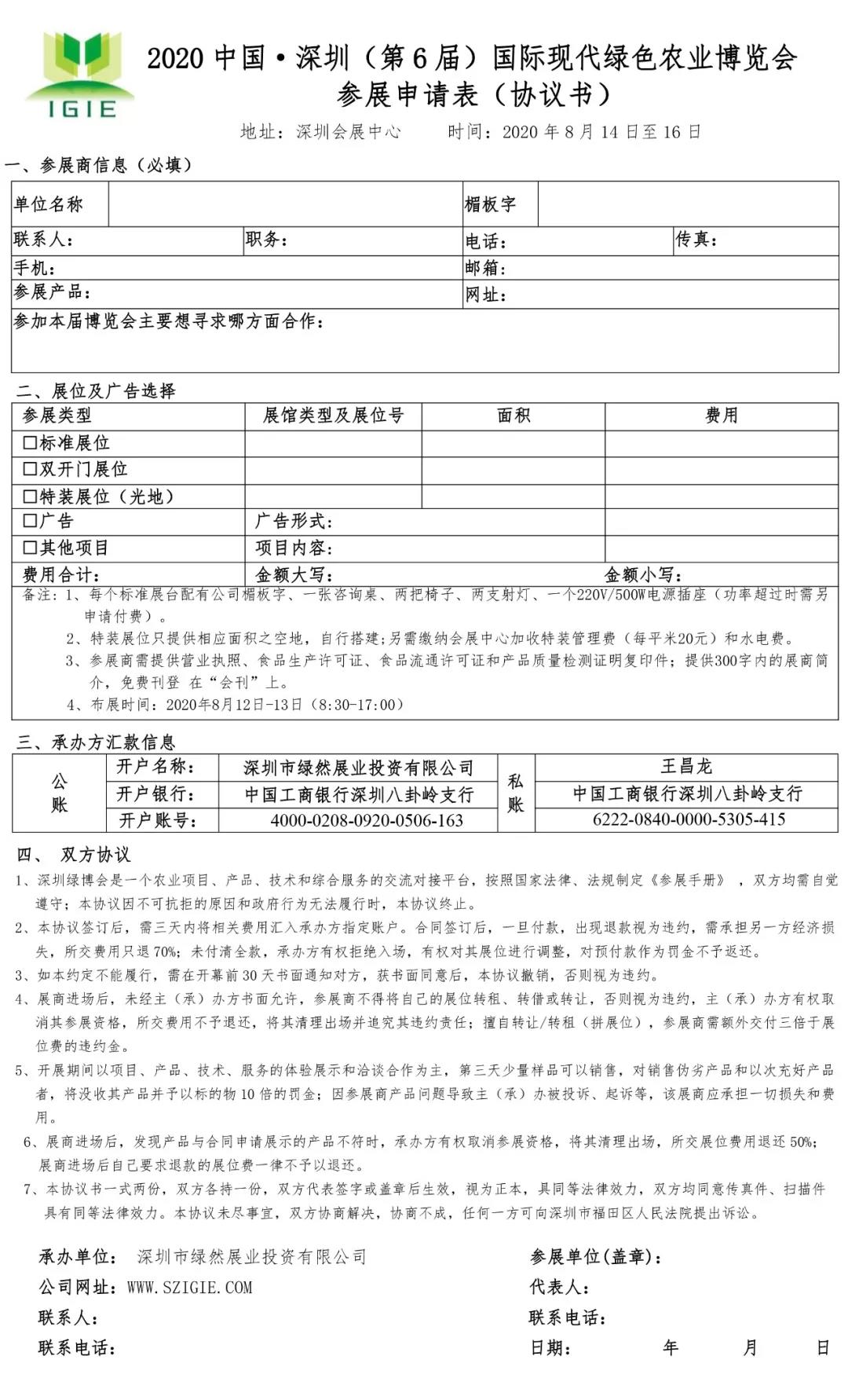 中国·深圳(第6届)国际现代绿色农业博览会(以下简称“深圳绿博会”)定于2020年8月14-16日在深圳会展中心7、8、9号馆举行,展出面积37500平方米。同期举办中国·深圳国际生态与智慧农业技术应用高峰论坛。