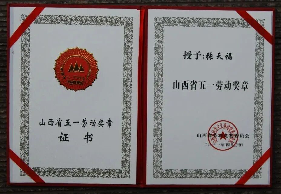 2011年5月,张天福同志被山西省委、省政府授予“山西省五一劳动奖章”