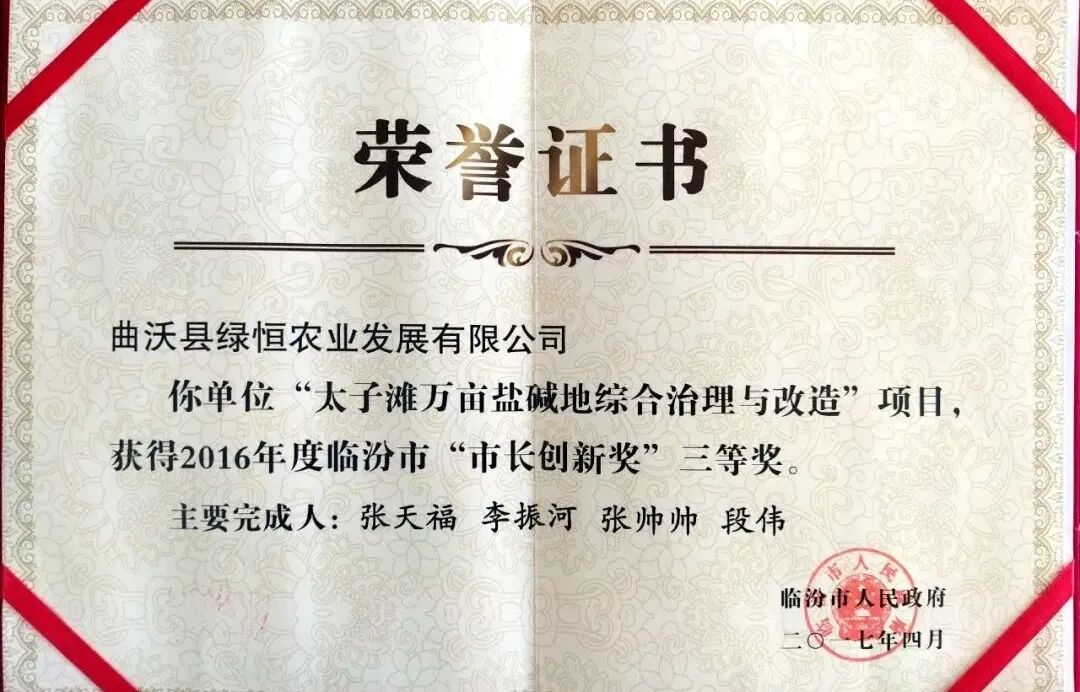 经过8年多的开发建设,曾经贫瘠荒芜的太子滩万亩盐碱地,如今焕发出勃勃生机,已变成一家集高科技智能温室区、农光互补产业区、南渔北引示范区、双千亩莲鱼共养区、晋国文化游览区、生态湿地保护区六大区域于一体,具有现代农业示范、特种水产养殖、文化旅游观光、湿地公园休闲、大气环境改善、工业用水保障六大功能的省级现代农业示范园区,初步形成了“企业带基地、基地带农户、农户促企业”的良好格局。绿恒农业先后荣获“全国基层农业科技试验示范基地”“全国休闲农业与乡村旅游星级企业”“省级休闲农业与乡村旅游示范点”“农业产业化省级重点龙头企业”“山西省无公害水产品产地”“山西省无公害农产品产地”“山西省蔬菜产业十佳优秀园区”“临汾市市长创新奖”等多项称号。