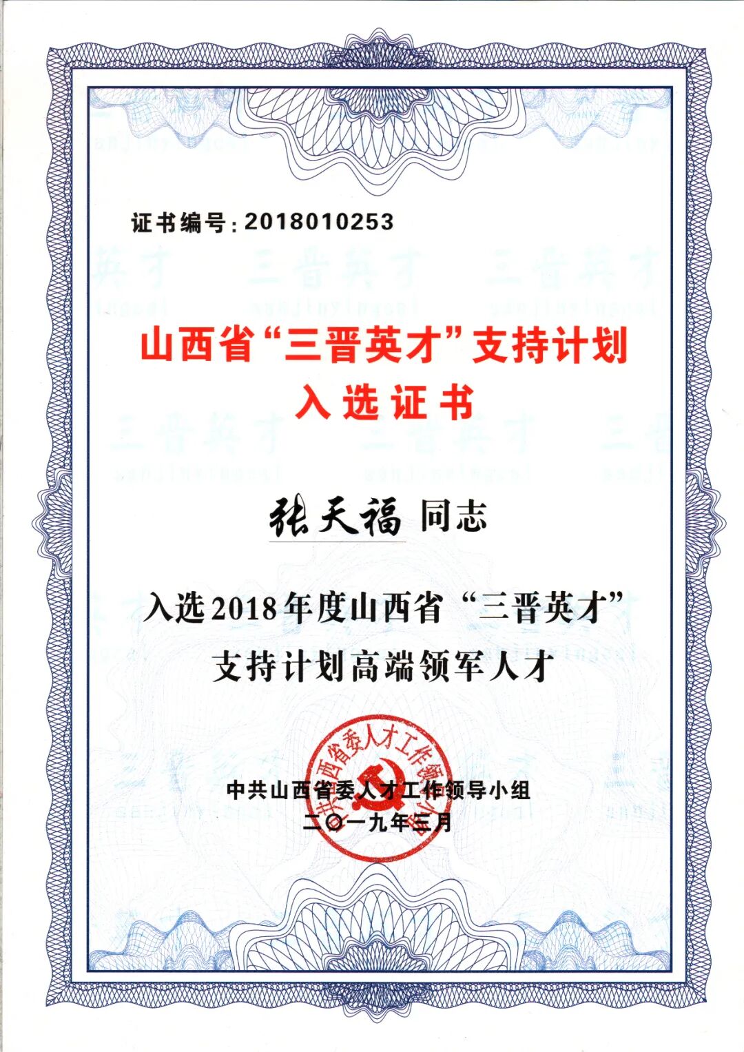 2019年3月,张天福同志被山西省委、省政府授予三晋英才“高端领军人才”