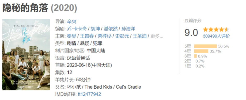 今年最牛的国产剧,就是最近在朋友圈狂刷存在感的《隐秘的角落》了,豆瓣评分超过9分的国产剧。