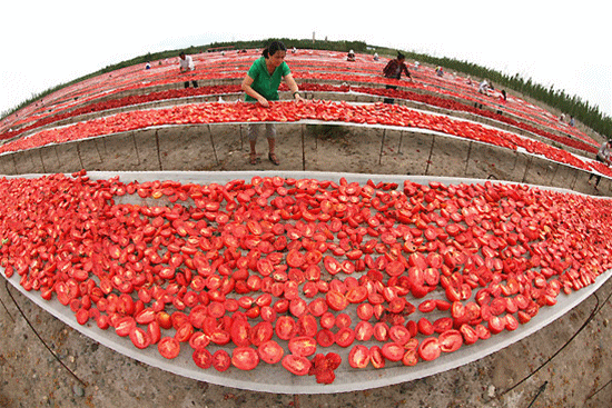 每年8月,新疆焉耆盆地30万亩番茄采摘晾晒工作进入旺季,经过几十年的发展,新疆生产建设兵团第二师番茄种植全面采用大棚育苗移栽和滴灌节水技术,番茄产量逐年提高,平均亩产7吨,最高可达9吨。
