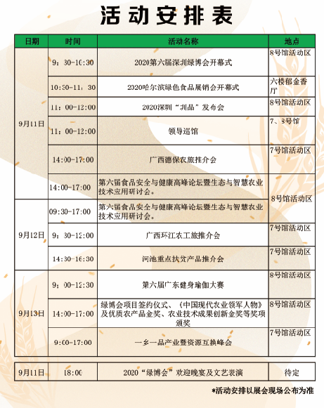 今年的深圳绿博会还有很多丰富的现场活动,有2020深圳“圳品”发布会、广西德保农旅推介会、广西环江农工旅推介会、河池重点扶贫产品推介会等原产地农产品推介会,还有第六届食品安全与健康高峰论坛暨生态与智慧农业技术应用研讨会等专业论坛活动。让你乘兴而来,尽兴而归!