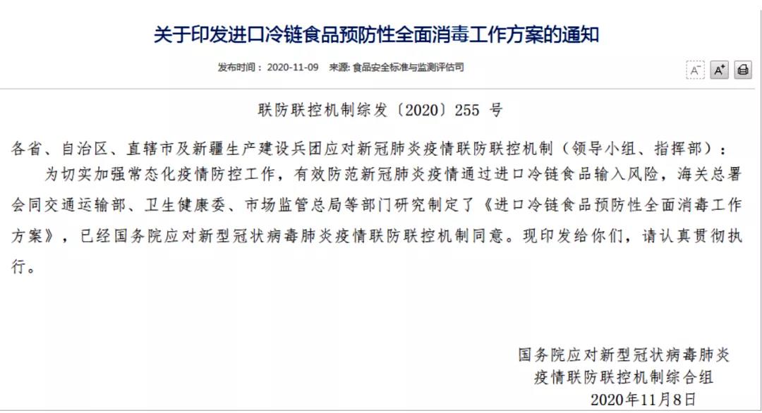 2020年11月8日,国务院应对新型冠状病毒肺炎疫情联防联控机制综合组下发了《进口冷链食品预防性全面消毒工作方案》,要求各地应对新冠肺炎疫情联防联控机制(领导小组、指挥部)贯彻执行。方案要求在做好进口冷链食品新冠病毒检测工作的基础上,对进口冷链食品的装载运输工具、产品外包装进行消毒。