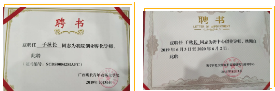 荣获2020并聘为广西大学青年农场主学院创业孵化导师