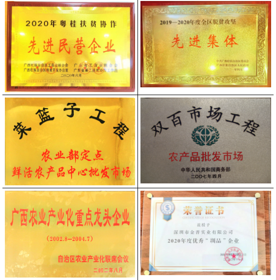 旗下企业荣获中国供销合作总社重点龙头企业、广西农业产业化重点龙头企业、深圳“菜篮子工程”、“农业龙头企业”、“老字号”企业,中国品牌影响力100强、中国质量示范品牌100强、粤桂扶贫先进民营企业、广西壮族自治区脱贫攻坚先进集体等荣誉。