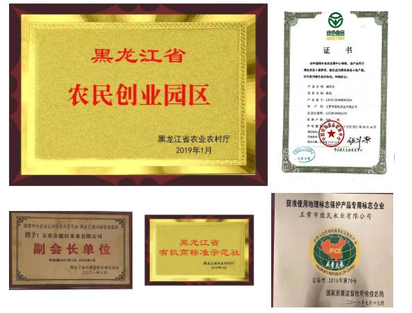 2020年获得国家级绿色工厂(获得ISO9001质量管理体系认证,ISO14001环境管理体系认证,ISO45001职业健康安全管理体系认证,ISO50001能源管理体系认证),规模以上企业;被评选为哈尔滨农业产业化市级重点龙头企业、第十三届全国粮油经销商订购会“金奖”企业、绿色食品认证通过,颁发绿色食品证书、“农担杯”黑龙江省优质农产品营销大赛中荣获三等奖、黑龙江省农民创业示范(实习)基地公司、黑龙江省创业园区、黑龙江省有机高标准示范社。