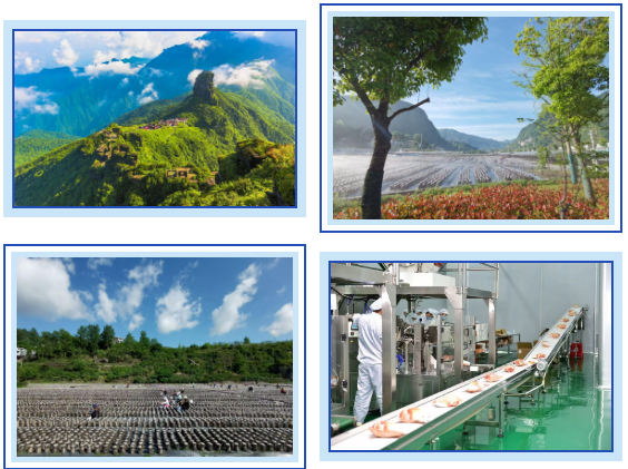梵天菌业位于梵净山西麓,梵净山系世界自然遗产、国家5A级旅游景区,国家级自然保护区、中国十大避暑名山、国际“人与生物圈保护网”(MAB)成员,有每立方厘米10万+负氧离子,有纯天然山泉水和溶洞水,被誉为“北纬28°最后一方净土”。属亚热带湿润季风气候,年均气温16.8℃,日照时间达1255小时,无霜期近300天,年降雨量1100mm左右。冬无严寒,夏无酷暑。冬季室外风速0.9m/秒,夏季室外风速1.0m/秒,年极大风速12m/秒,极端最高气温37.9℃,极端最低气温-9.0℃,冬季大气压力969.1百帕,夏季大气压力953.0百帕,热7月,冷1月,昼夜温差大,年平均有霜期74天;森林覆盖率91%,人口密度小,空气质量好,地表水质无污染;梵净山特定的气候、特定的生态造就了梵天菌业食用菌独特的有机品质,是得天独厚的武陵山脉大自然孕育的“精灵”。