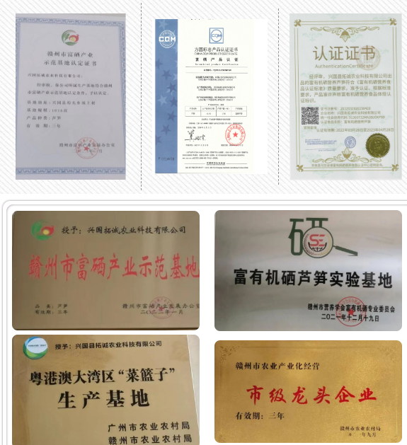 公司坚持以科技引导和绿色健康为立企之本,先后与南京农业大学、江西省农科院、南昌大学、赣南农科院等科研院校建立紧密型科技合作机制,合作建立了“国家农作物品种试验示范基地”、“江西省农科院蔬菜产业示范基地”“江西省农科院芦笋科研试验示范基地”、“兴国县国际芦笋种质资源圃与新品种示范园”、“赣南稀土转光膜和稀土补光灯实验基地”、“2030健康中国富有机硒营养农业科技创新示范基地”等园区和基地。先后获得八项实用发明专利证书,富硒芦笋认证证书,富有机硒营养芦笋认证证书等。
