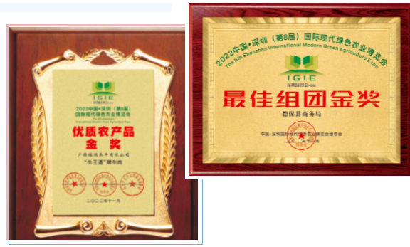 德保县商务局荣获最佳组团金奖、德保县湘里食品有限公司总经理胡朝霞、广西绿鸿养牛有限公司董事长朱慧琳获得中国现代农业领军人物奖、广西绿鸿养牛有限公司、“牛王道”牌牛肉获得2022年中国·深圳(第8届)国际现代绿色农业博览会优质农产品金奖。